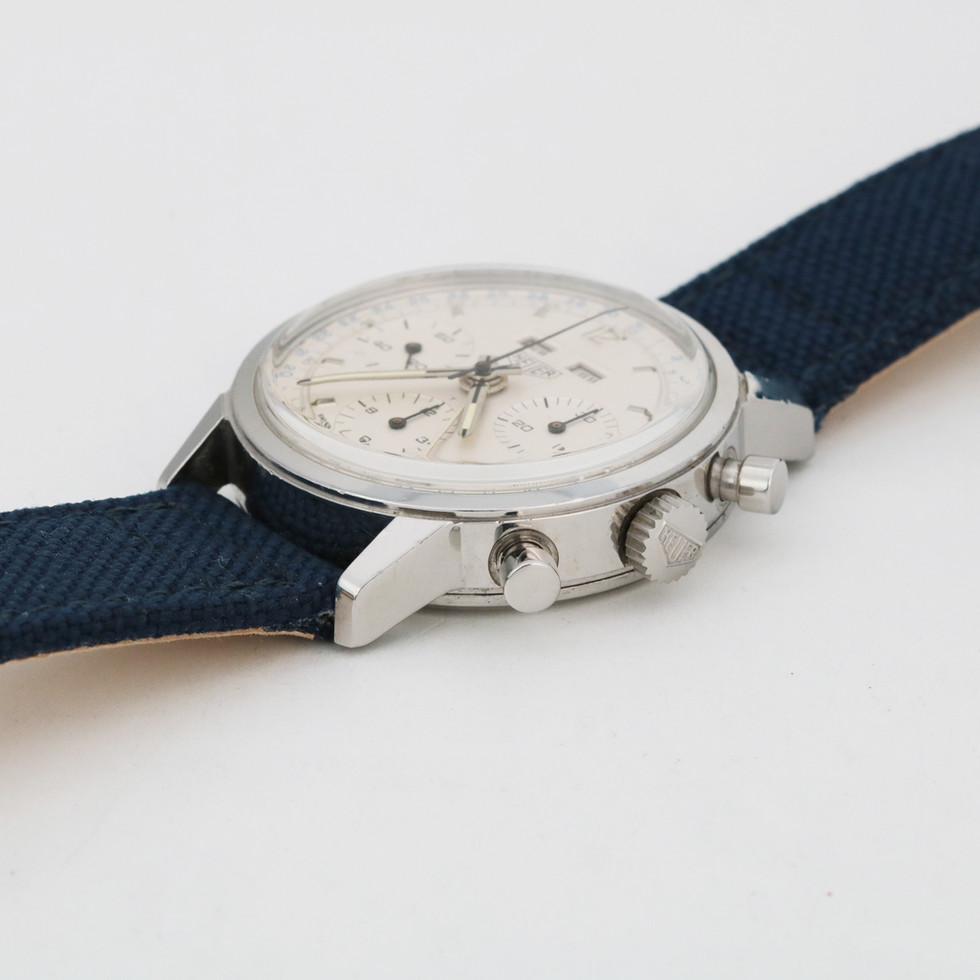 This is an incredible Heuer Carrera 12 Dato Reference 2547 Triple Date Chronograph from the 1960's. The condition of the watch is special. The case is unpolished with signs of normal wear. The watch even has its original Heuer crown The original white dial with 3 white registers is absolutly pristine. The white dial has aperatures for the month and date as well as outer blue tracking for the date. The watch is powered by a manual wind Valjoux 723 movement. This is a fantastic vintage Heuer with lots of complications.
