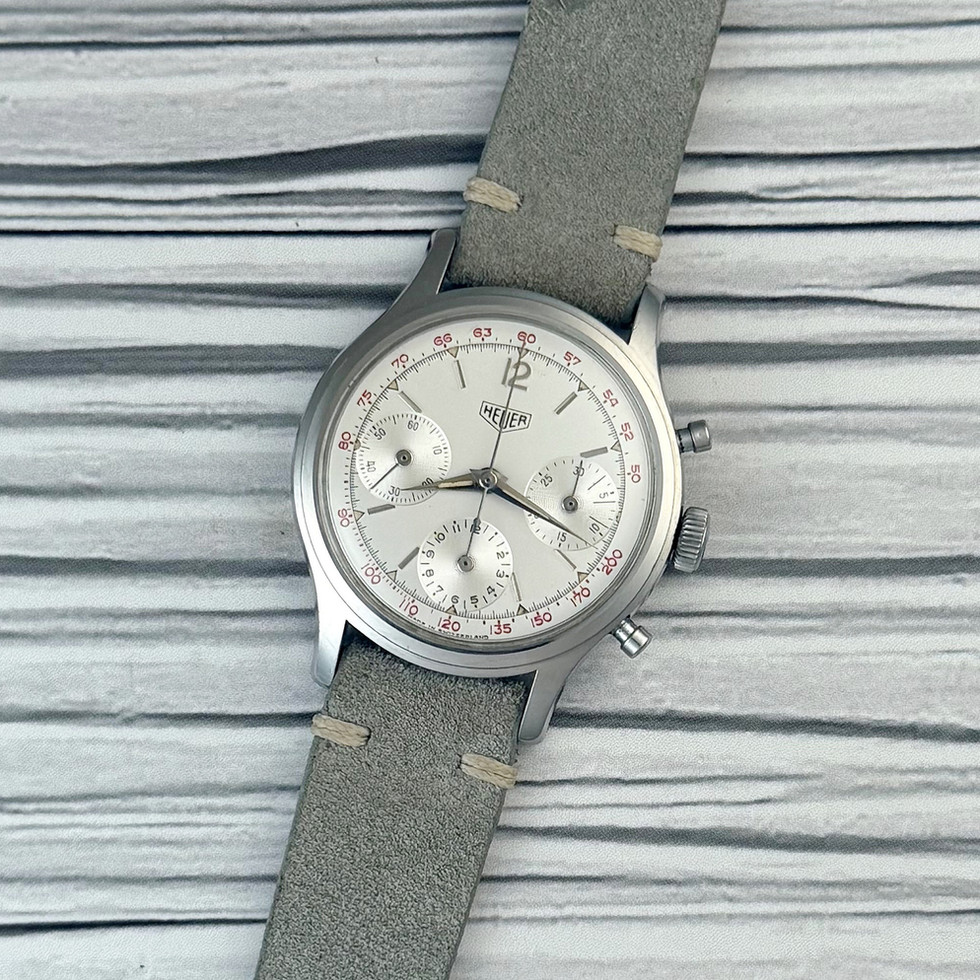 This is an extremely well preserved Heuer stainless steel chronograph from the early 1960's. The stainless steel case with water resistant screw down case back looks to be unpolished. The silver dial is in pristine condition with a red outter Tacymeter scale. This beauty is powered by the iconic Valjoux 72 manual wind movement which powers so many collectible vintage watches. I really love the condition of this piece as well as its understand beauty.